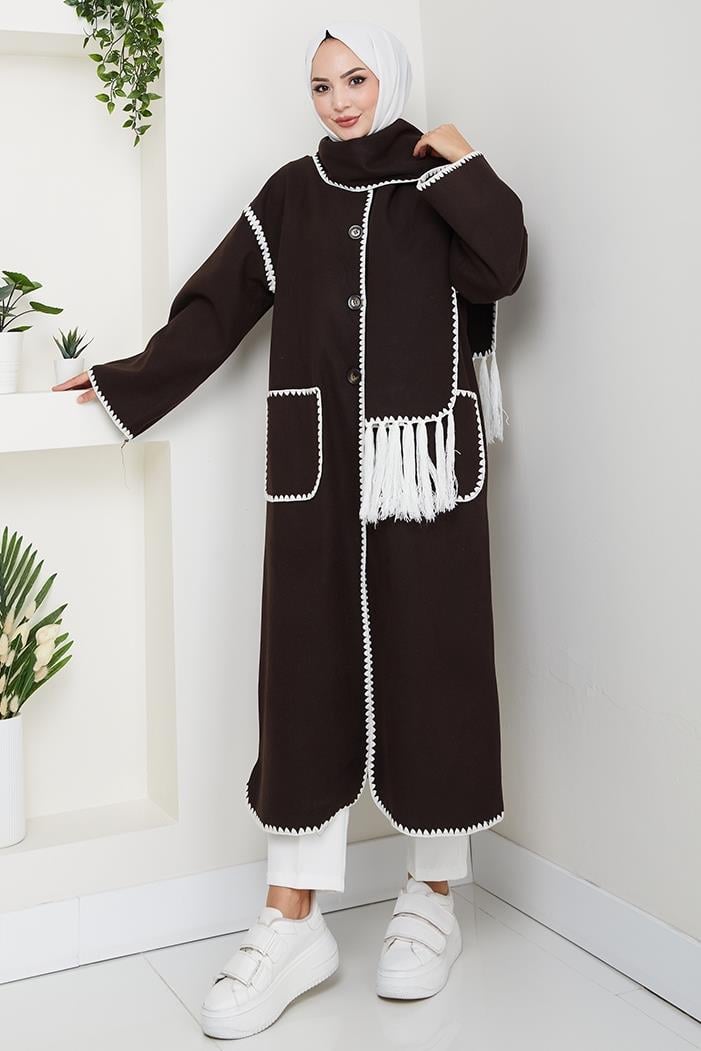 Arlin Atkılı Kaşe Uzun Ceket 1591 - Acı Kahve