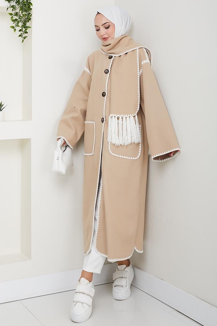Arlin Atkılı Kaşe Uzun Ceket 1591 - Taş (CDILK0ANT1591-Taş)