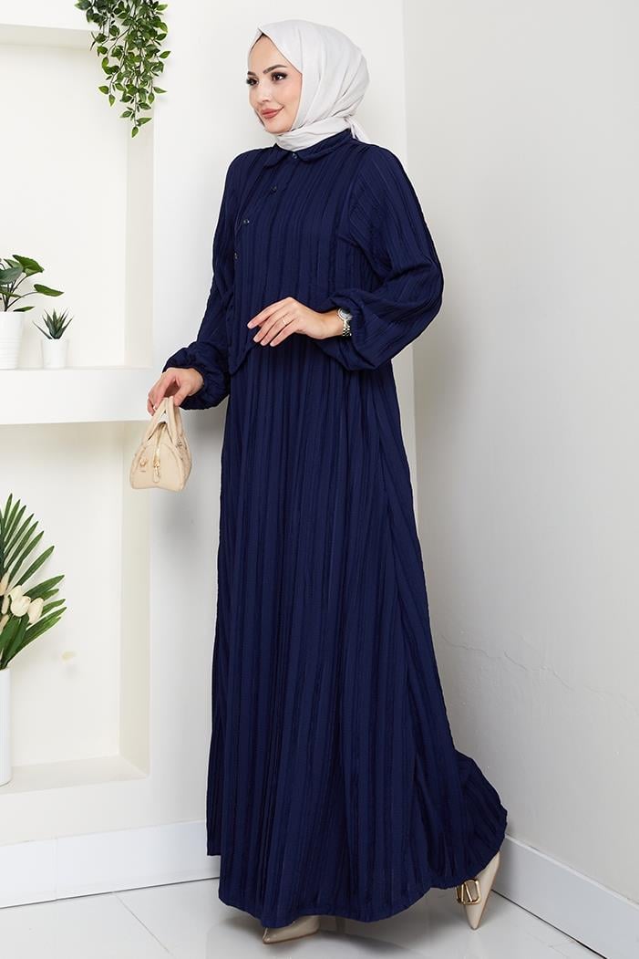 Çapraz Bağlamalı Bürümcük Elbise 1617 - Lacivert (CDILK00EFL1617-Lacivert)