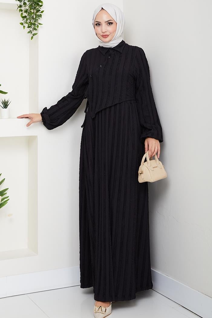 Çapraz Bağlamalı Bürümcük Elbise 1617 - Siyah