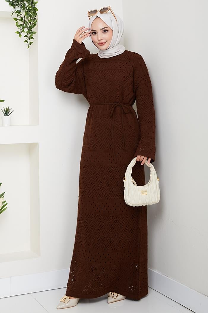 Dantel Motifli Astarlı Triko Elbise 1601 - Acı Kahve