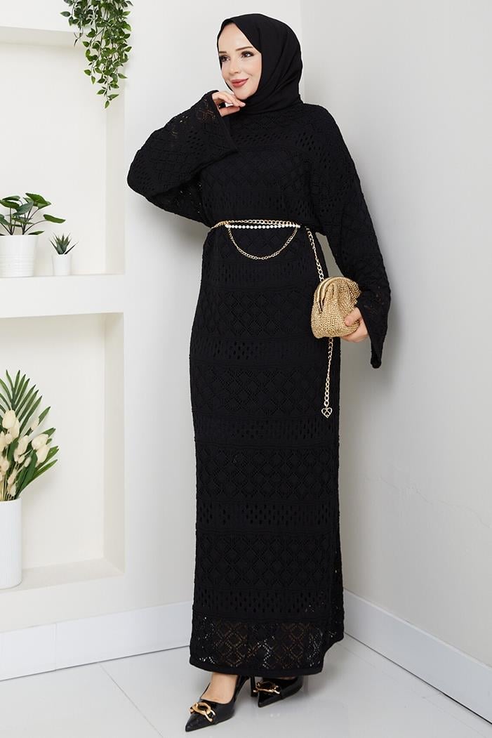 Dantel Motifli Astarlı Triko Elbise 1601 - Siyah