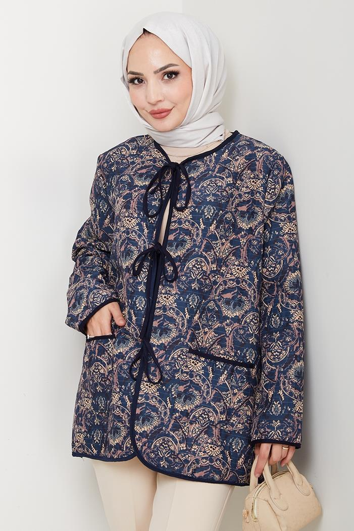 Etnik Desen Bağlamalı Kapitone Ceket 1618 - Lacivert (CDILK00EFL1618-Lacivert)