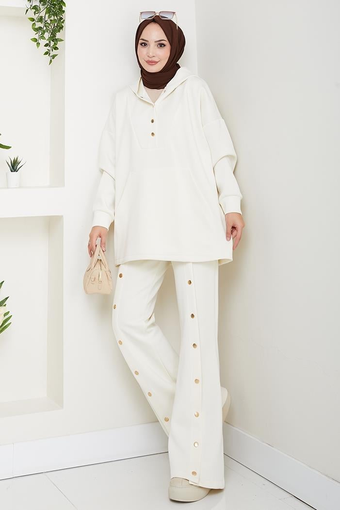 Kapüşonlu Düğme Detaylı Scuba Takım 1592 - Beyaz (CDILK0ANT1592-Beyaz)