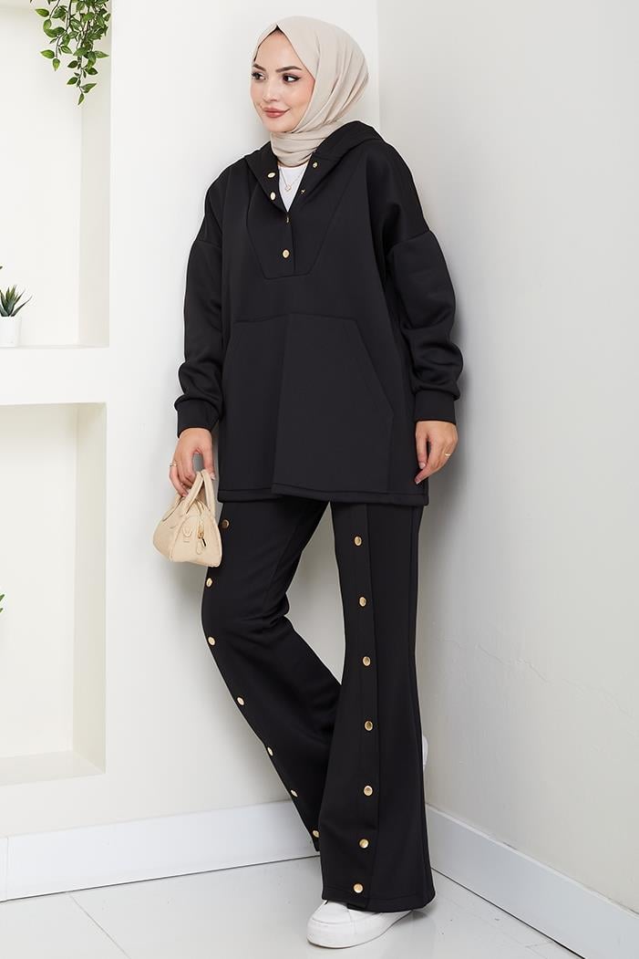 Kapüşonlu Düğme Detaylı Scuba Takım 1592 - Siyah