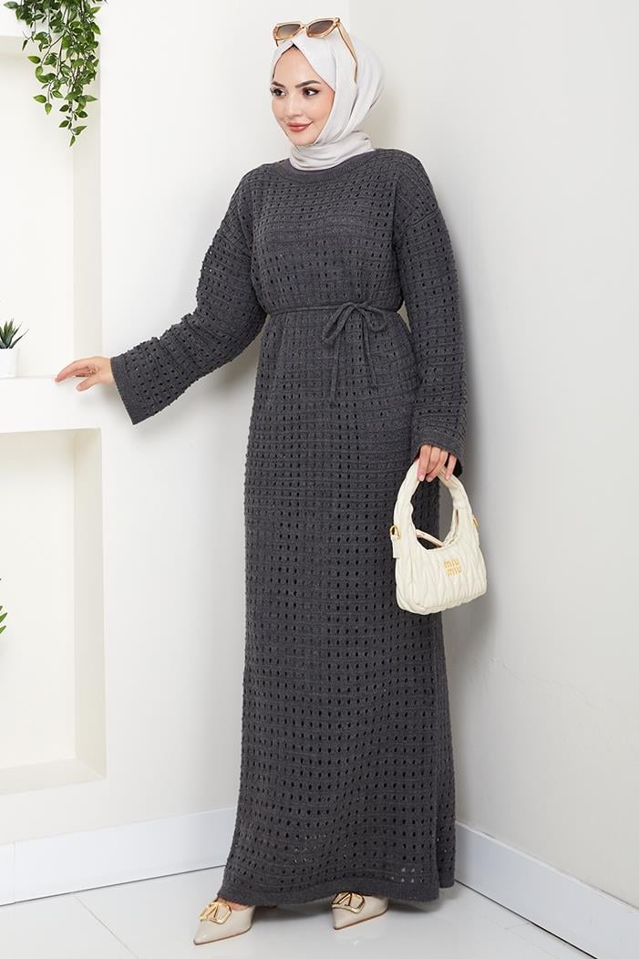 Kemerli Dantel Detay Astarlı Triko Elbise 1602 - Antrasit (CDILK00RFM1602-Antrasit)