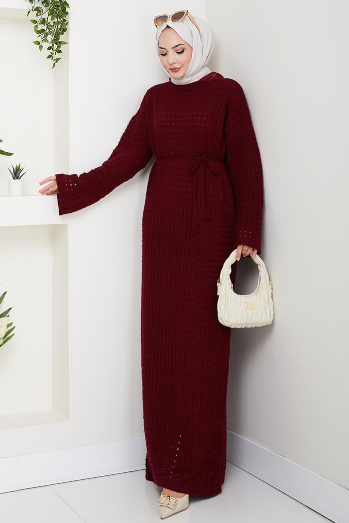 Kemerli Dantel Detay Astarlı Triko Elbise 1602 - Bordo