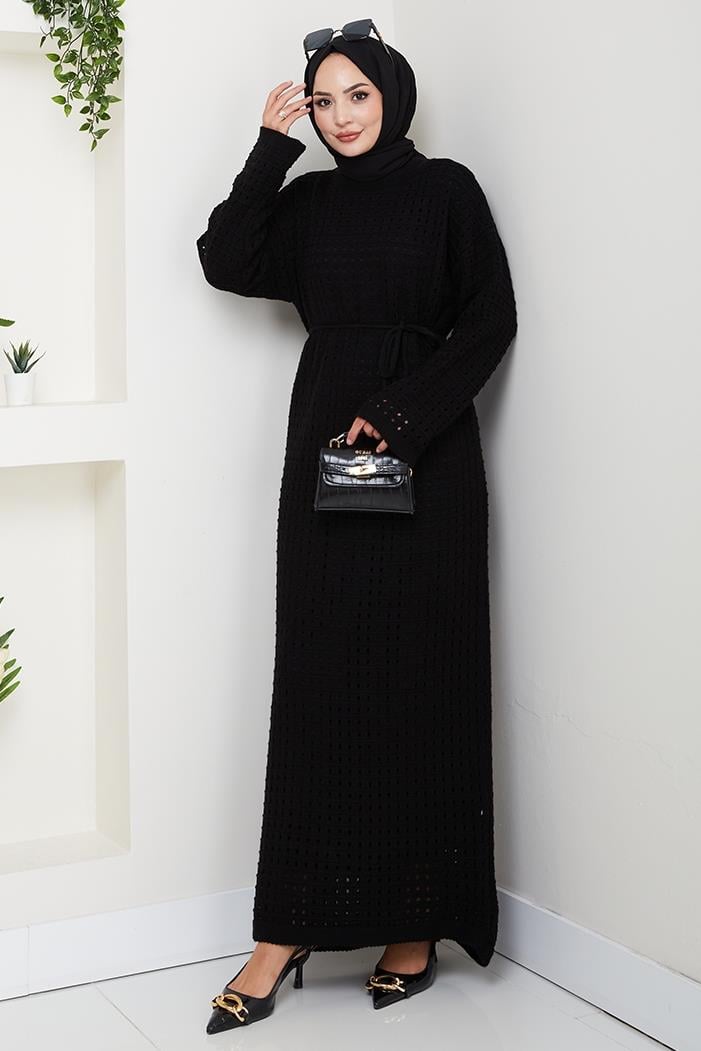 Kemerli Dantel Detay Astarlı Triko Elbise 1602 - Siyah