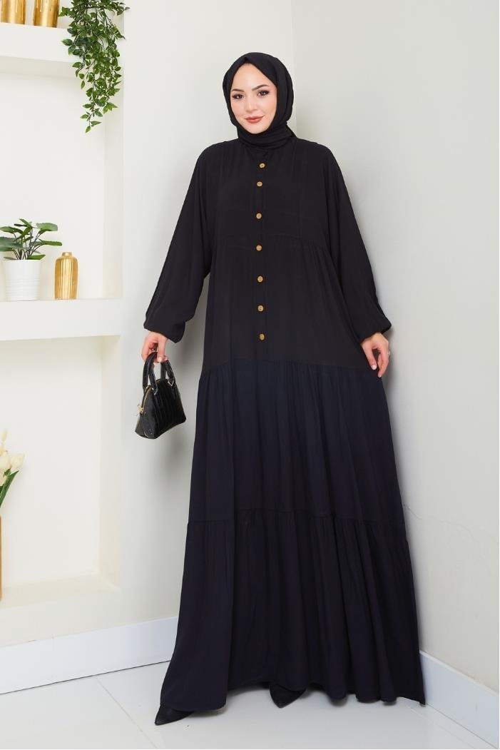 Kiyar Yarım Düğmeli Dokuma Viskon Elbise 1510 - Siyah (CDILK0NZR1510-Siyah)