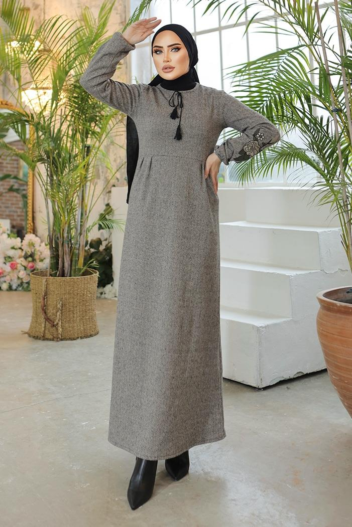 Kolları İşlemeli Tesettür Elbise 755 - Bej