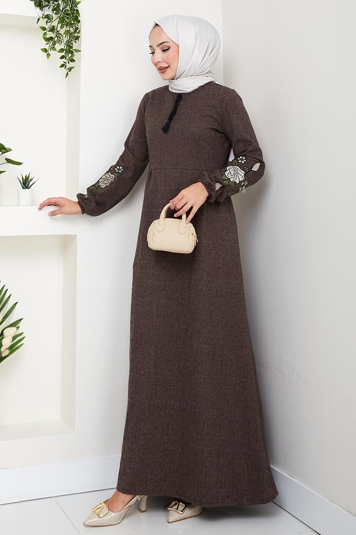 Kolları İşlemeli Tesettür Elbise 755 - Kahve (CDILK00UKB755-Kahve)
